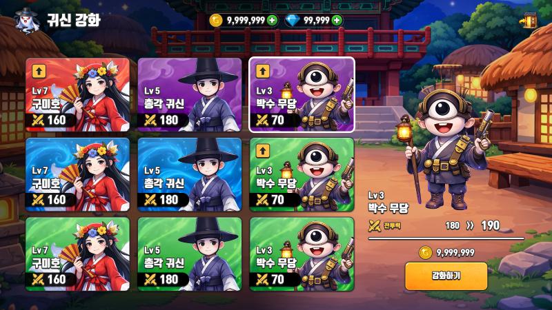 Players collect and upgrade various Dokkaebi and spirit characters, engaging in gameplay that combines board-style mechanics with real-time action elements. Each character has unique abilities, encouraging strategic combinations and timing-based play.