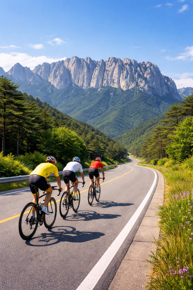 Up and down the road winding across the Baek-Doo ridges, a bunch of cycling riders are pedaling,,, With already delivered casting message to get on to the open road across the DMZ,,,, Not knowing when to have this happen no earth,,,, Is this season also come to an end with cyber reality performance,,,, leaving accumulated running mileage far beyond douzen planet round mileages,,,