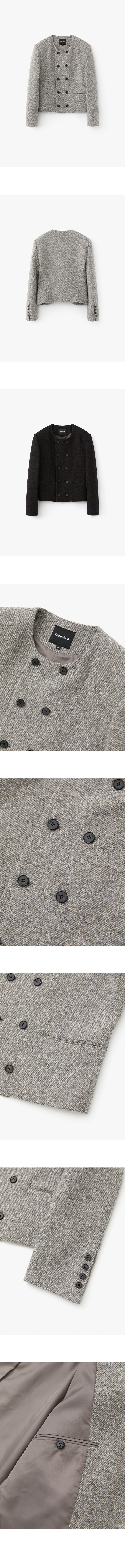 A winter wool jacket designed with a round neckline. Crafted from wool with a tweed-inspired texture and design, offering a refined seasonal look. Available in grey and dark brown.