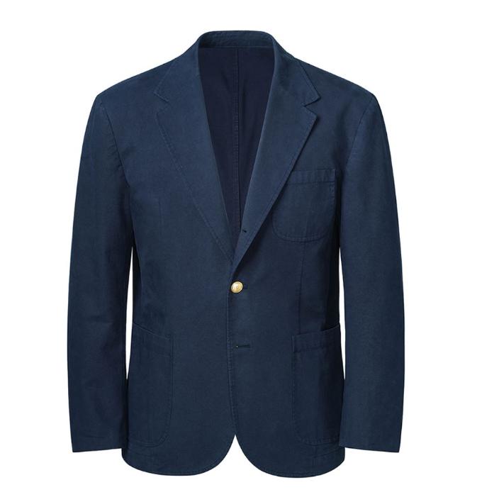 This blazer reinterprets EdwardMax’s signature gold button blazer in 100% cotton. A bio-washed finish gives the fabric a softer touch and a naturally worn-in character, creating a balance between comfort and a clean silhouette. With gold buttons, a 3-roll-2 front, patch pockets, and a single vent, it reflects a classic American menswear approach while remaining easy to style with denim, chinos, or tailored trousers.