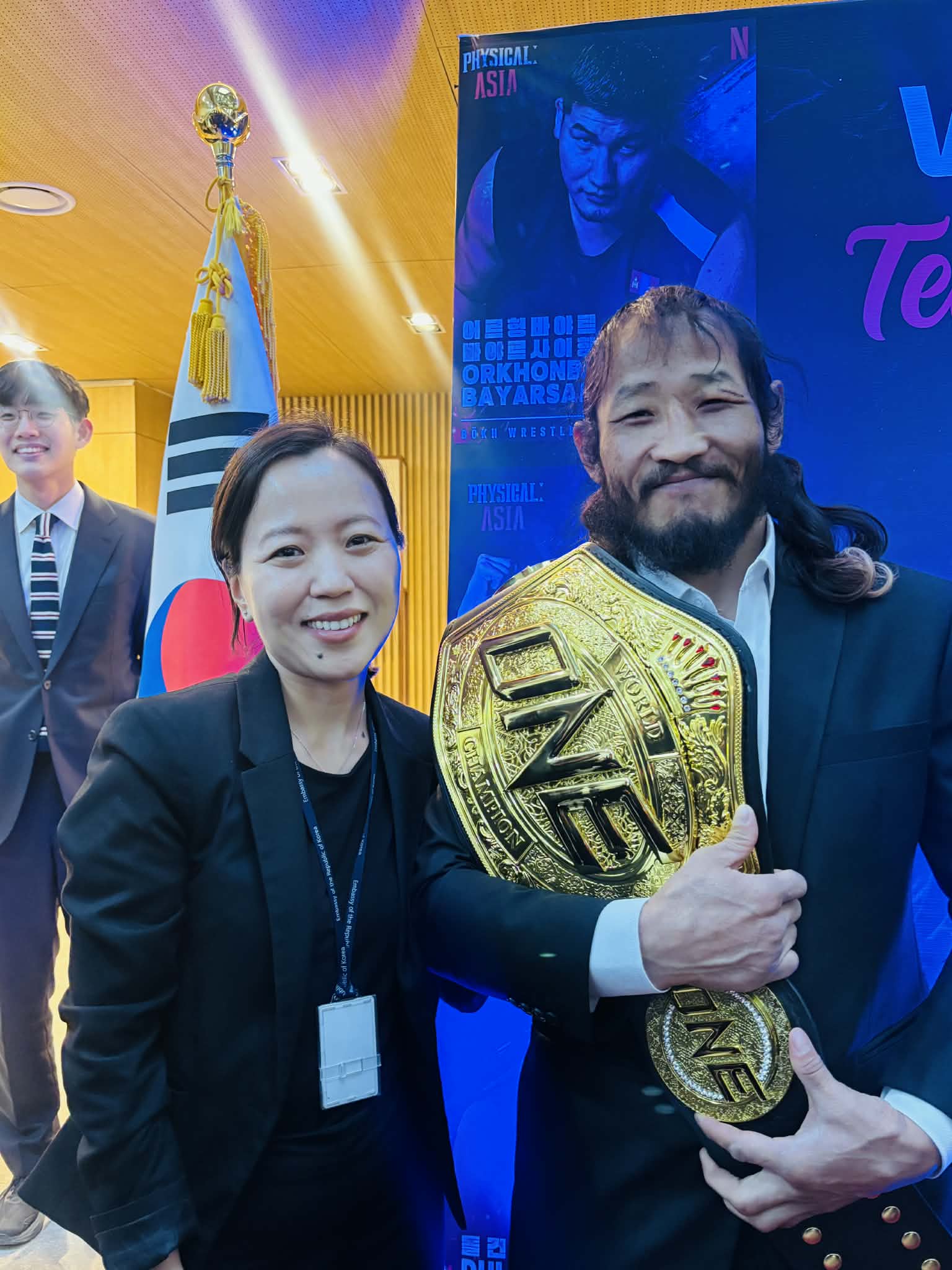 < 방콕에서 열린 ‘원 챔피언십’의 65kg급 세계 챔피언에 오른 엥흐어르길 선수와 통신원 - 출처: 통신원 촬영>