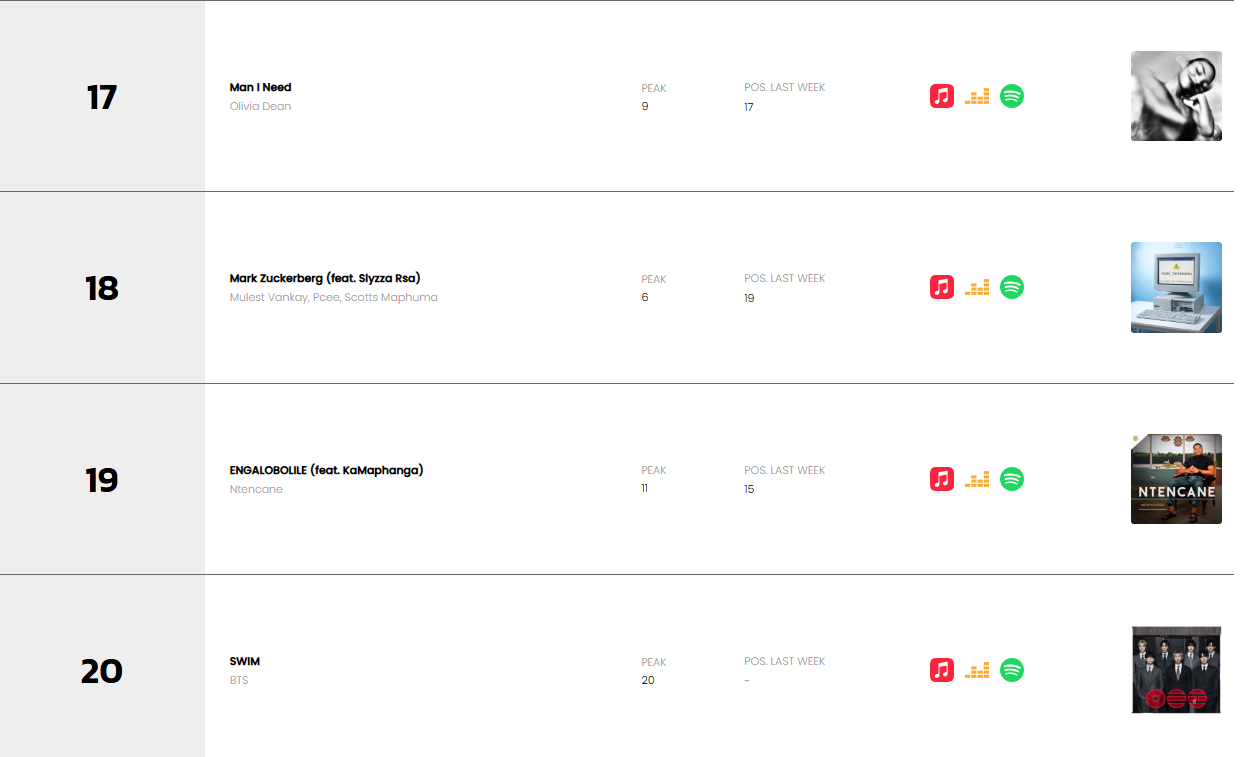 반대로 스트리밍 기반 차트에서는 다른 이야기가 펼쳐진다. 스포티파이 남아공 3월 마지막 주 주간 인기 차트에서 BTS의 <스윔(Swim)>은 20만 5,874회의 스트리밍으로 50위에 머물렀다. 같은 날 차트 상위권은 트레치슨 몰리 브이엑스(Trechyson Molly vx)와 디제이 프로매틱 에스에이(DJ Promatic SA), 덴도펠라(Dendofela)가 만든 아마피아노 곡 <보체로 케 엥(Botshelo Ke Eng)>, 페자(Feza)의 <우마콘다나(Umaqondana)>, 템스(Tems)와 함께한 데이브(Dave)의 <레인댄스(Raindance)>, 엔텐카네(Ntencane)의 <우케테 미나(Ukhethe Mina)> 같은 세츠와나 혹은 줄루어로 된 현지 음악이 차지하며 각 80만 회에 가까운 주간 스트리밍을 기록했다. 특히 스포티파이는 스팸 재생을 필터링하는 알고리즘을 적용해 실제 청취 행동을 반영하며, 차트 집계 기간이 금요일부터 목요일까지여서 일시적 관심은 쉽게 누적되지 않는다. 따라서 팬덤의 집중적인 스트리밍 만으로는 높은 순위를 유지하기 힘들다. 빌보드가 집계하는 남아공 음악 차트도 스트리밍과 다운로드를 가중치로 결합하는데, 이 차트에서 <스윔(Swim)>은 11위에 데뷔했다. 이는 아이튠즈처럼 팬덤의 구매가 반영되지만 스포티파이, 애플 뮤직, 디저(Deezer) 등 여러 플랫폼의 데이터를 함께 고려하므로 다양한 대중 층에서 일정한 소비가 있어야 상위권에 오를 수 있음을 뜻한다.